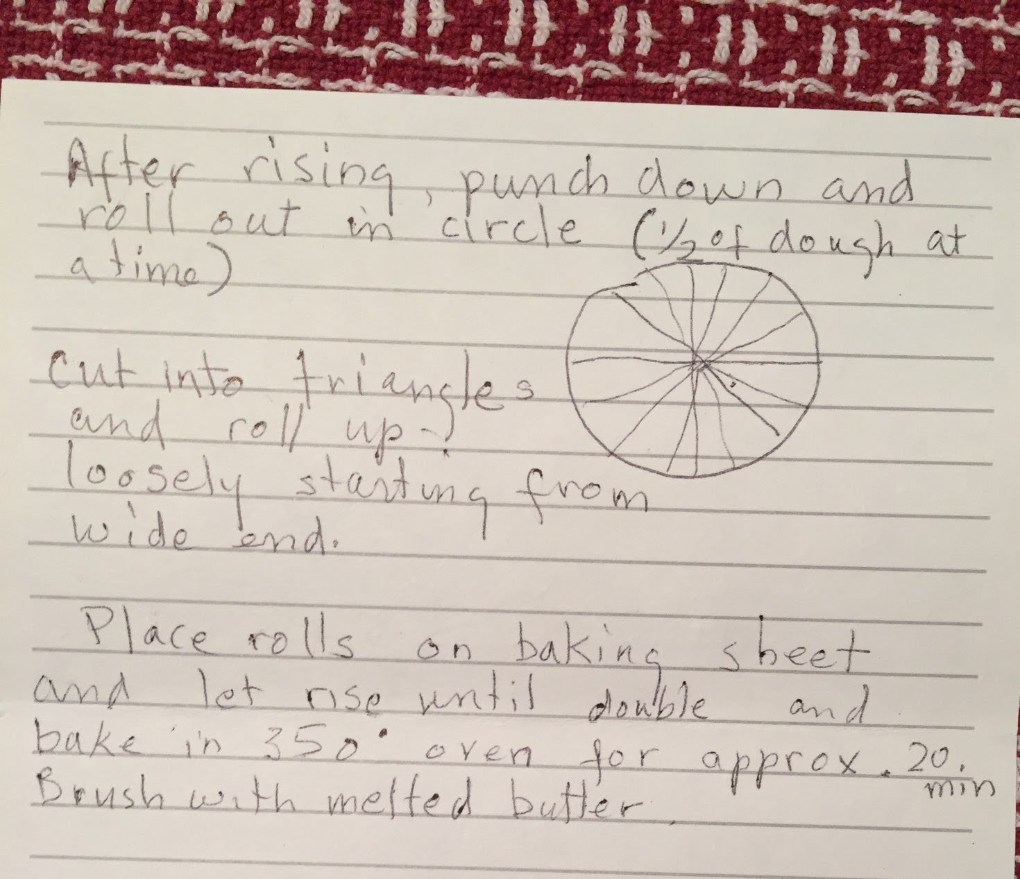- After rising, punch down and roll out into 2 circles. (See diagram on the photo of Grandma’s original recipe card above)