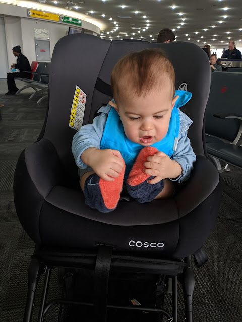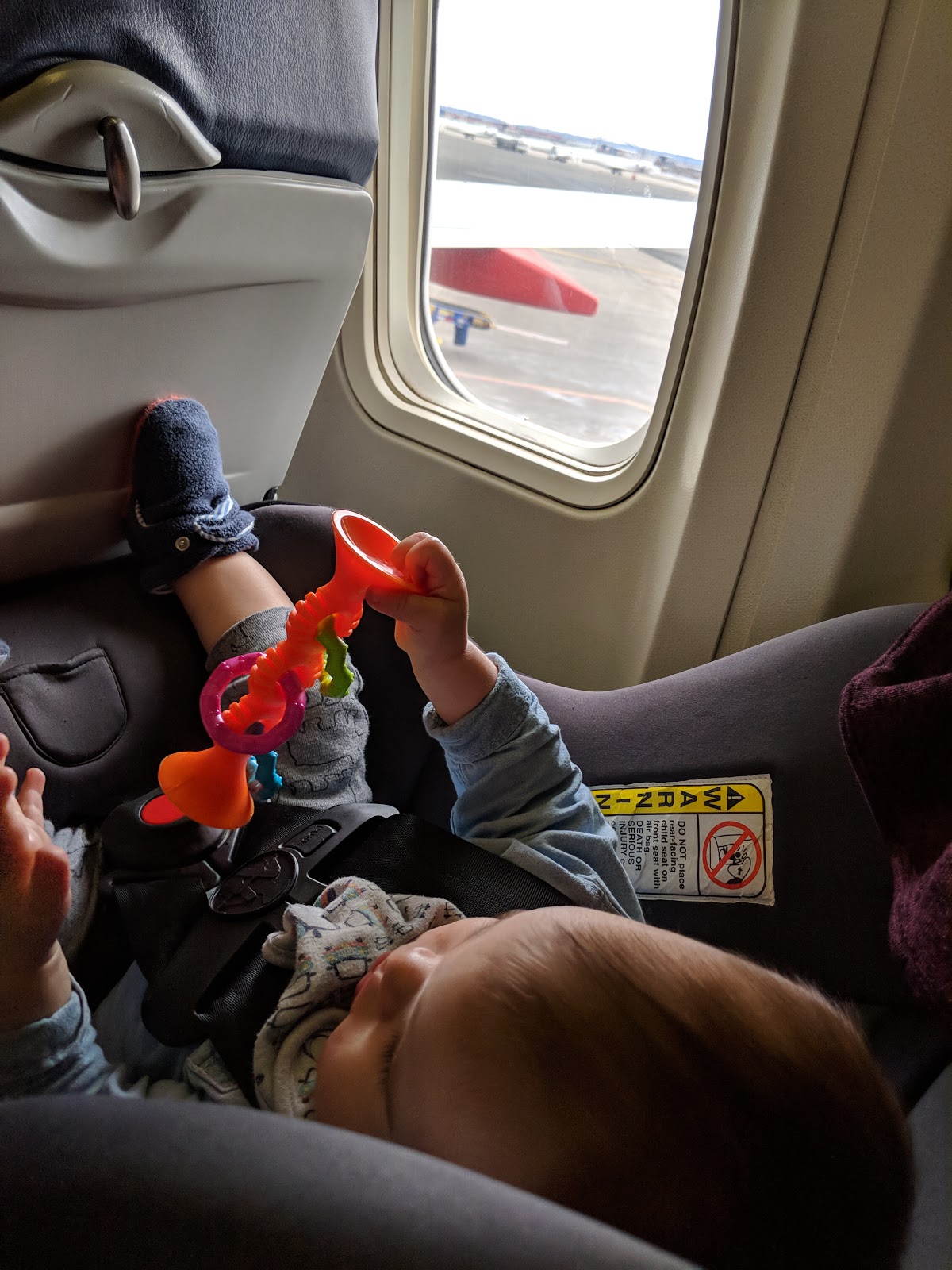 This is my “airport setup.” This Baby Trend Tri-Fold Mini stroller is perfect for easy folding and storage. It actually can be pushed down the airplane aisle and stored in overhead (though flight attendants do not like that option so I usually gate check it to avoid any confrontation.) Our lightweight Cosco Scenera Next carseat fits perfectly in the stroller and even has a buckle I can loop through to secure it if I want to. It’s not super secure or recommended by the manufacturer, but it is perfect for pushing stuff around the airport. I use these stroller hooks to hang bags on the stroller, and keep the other bags in the seat. For this trip, I wore the baby and my toddler walked, but I wanted to have the stroller just in case my toddler didn’t want to walk! I also find that I always have too much stuff to carry on to not bring the stroller to help push it all through the airport. We checked the baby’s car seat before security, but I kept the toddler’s seat (Scenera Next) to gate check just in case I wanted to take it on the plane. Almost every time we fly Southwest, there are extra seats on the plane and they will let you bring the car seat on for the lap child. So this time, even though this is my toddler’s car seat, I brought it on for the baby to sit in. It was nice to have a place to sit him down even though he wanted to be held the whole time anyway.
