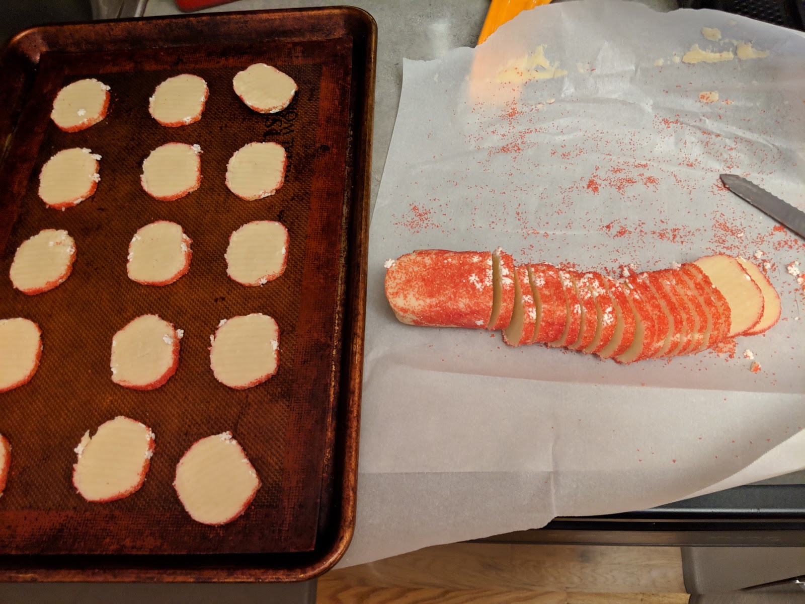 Beat butter, sugar, and vanilla in standing mixer. Then mix in flour. Place on parchment and roll into log. Roll the log in sprinkles and then roll up in parchment and refrigerate for 2 hours. Slice into 1/8-ish inch slices and bake 10 minutes at 350!